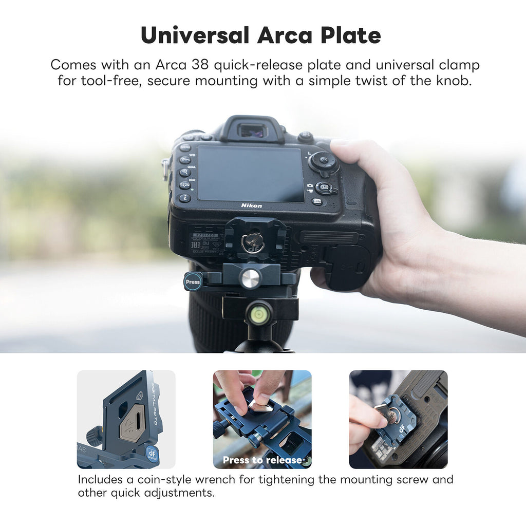 Equipped with an ARCA 38 quick-release plate, the VH-1AS allows for secure, tool-free mounting for any Arca-compatible tripod head. Just twist the knob, and you’re ready to shoot.