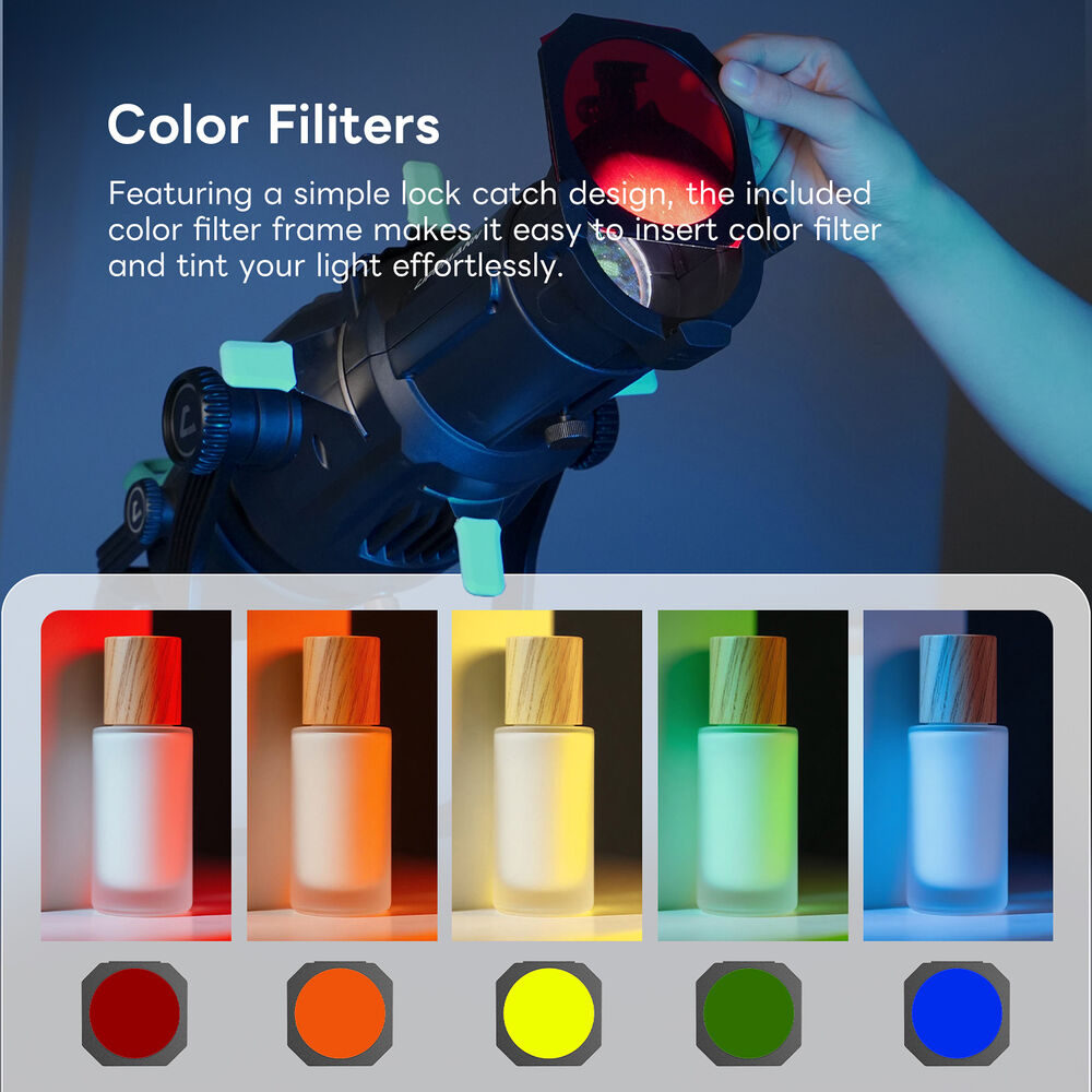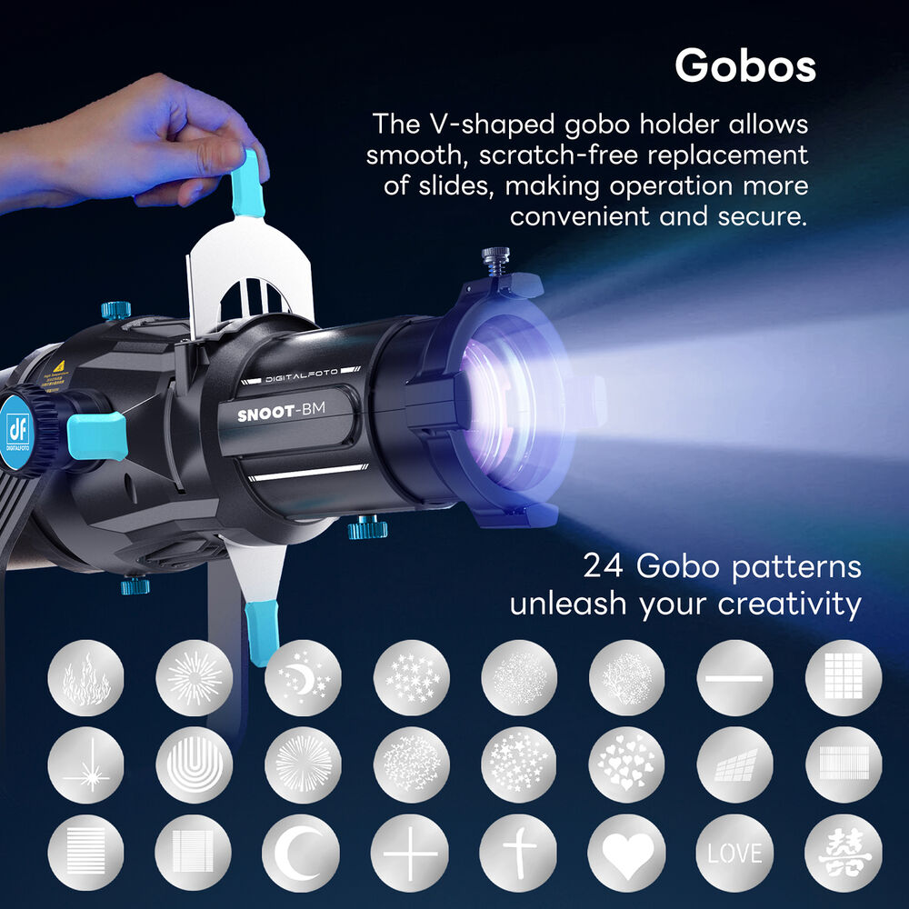 The kit includes 24 gobos, allowing you to project a wide range of patterns and textures onto backgrounds or subjects. Its V-shaped gobo holder ensures scratch-free gobo replacement and quick changes, keeping your workflow fast and efficient during shoots or performances.