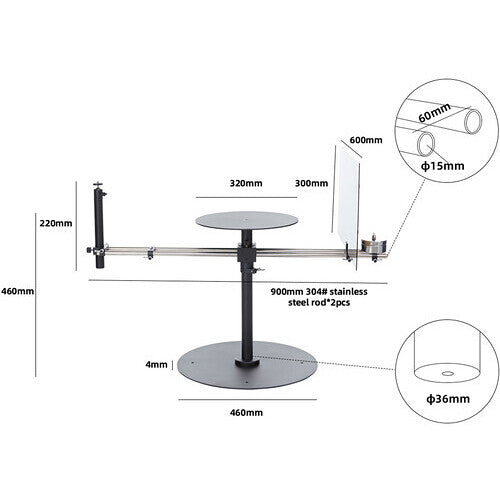 Create Stunning 360° Rotating Bullet-Time Shots with the DigitalFoto V360S 360° rotating platform with Dolly. Designed for filmmakers and videographers who want to create stunning 360° rotational shots. This versatile platform features multiple 1/4" mounting threads for mounting lights and monitors directly to the rig. It also supports vertical rotation for unique totation shots. It uses a 15mm rod system, enabling you to connect a plethora of video rig accessories. Its adjustable 220mm camera mounting rod allows you to fine-tune your camera height and angle for dynamic, professional-looking shots, making the V360S the ultimate tool for commercial videos, product shoots, and cinematic content.