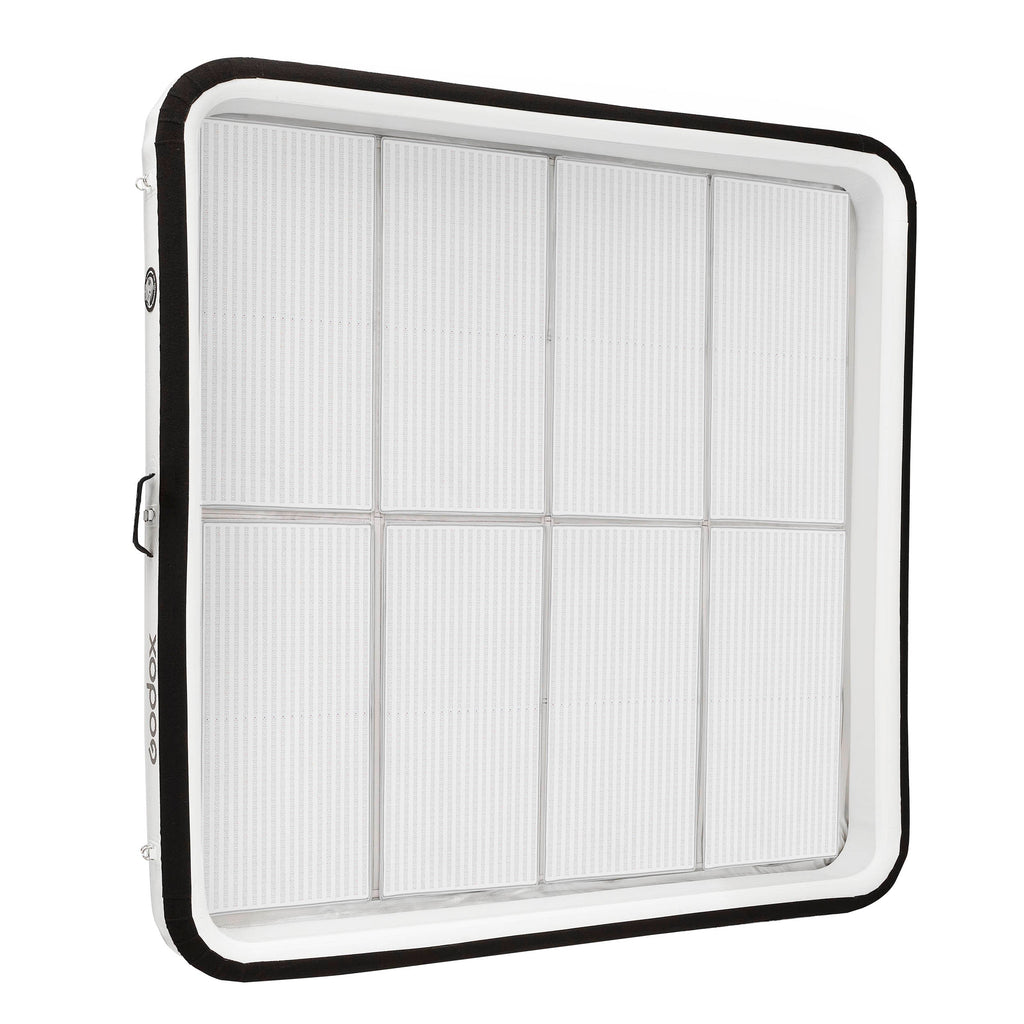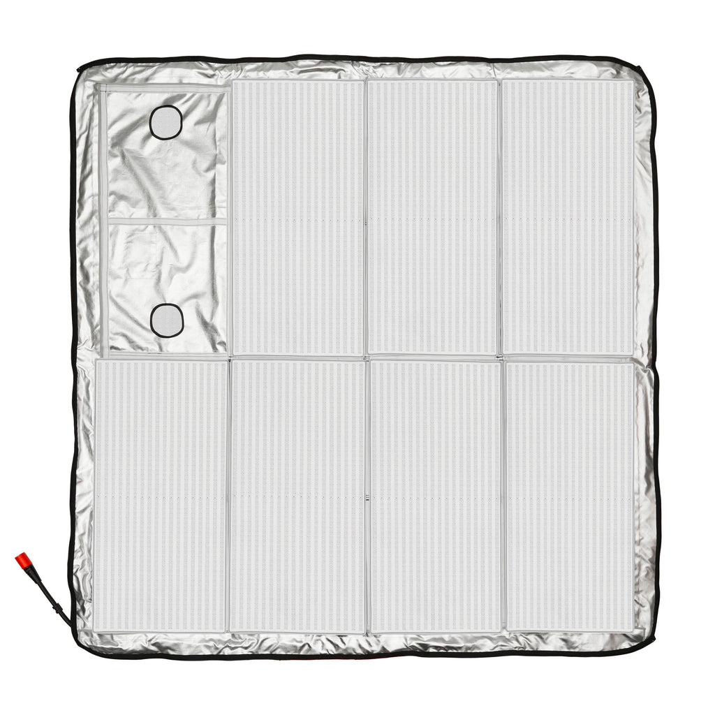 The KNOWLED AM1600R comes in two sizes: a 4'x8' model for increased brightness and an 8'x8' version that delivers softer light with broader coverage. Both variants share the same controller box, simplifying the process of assembling large light arrays. Its modular design features Velcro fasteners for quick panel swaps, while D-rings on the rear facilitate easy connection or extension of panels to accommodate various shooting needs.