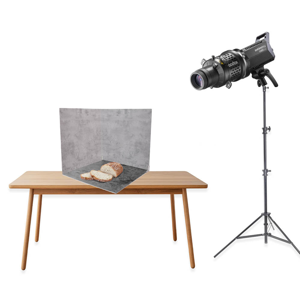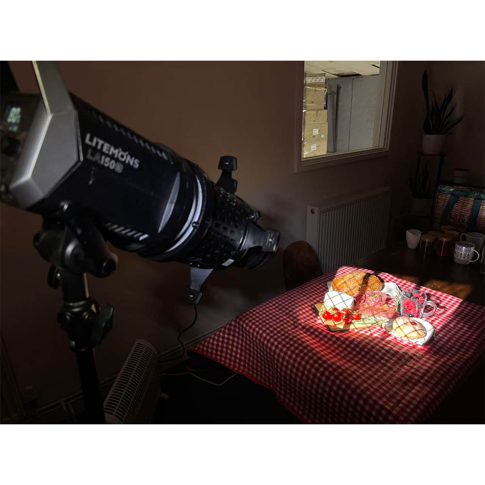 A compact, semi-pro continuous lighting kit for food and product photography, built around the LA150Bi bi-colour LED and the Godox BLP optical snoot for ultra-precise, sculpted light.