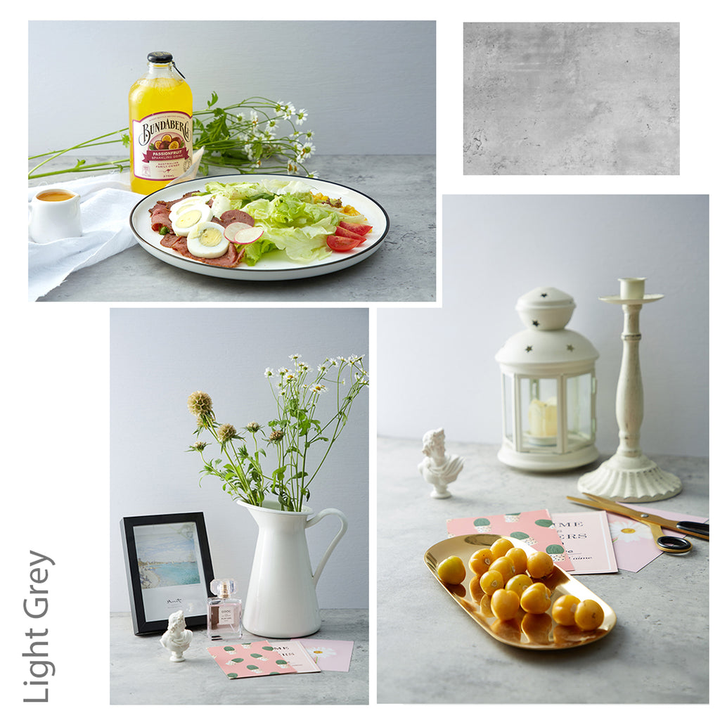 Stylised flat-lays and editorial mini-sets on the textured concrete board.