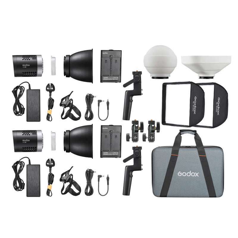 The Godox ML30 Daylight-Balanced Mini Pocket LED Light Twin Kit is a lightweight & portable lighting set-up, featuring 2x 30W LED lights as well as a selection of light modifiers to use. The included Godox ML30 Units are ultra-compact 37.6W 5600K daylight-balanced Handheld LED Lights, that use the latest High-Intensity Integrated LED technology, producing 37.6 watts of raw power, whilst being small enough to fit into the palm of your hand. Each lighting can be used either with the included handle or via the ML-TA1 Stand Bracket to allow the lights to be attached to a stand and used with an Umbrella. This kit includes a selection of modifiers, such as the ML-SF3030 30x30cm Rectangular Softbox, ML-CD15 Silicone Omni-Directional Diffusion Sphere & ML-CS1625 Silicone Soft Tent Diffuser. Finally, the included CB33 Carry Bag features a padded design to keep the equipment safe during storage & transportation. This kit is suitable for a wide range of Photography and Videography fields, such as Filmmaking, Marketing and advertising, Video Interviews, Green screen video, as well as portrait and Still-life Photography.