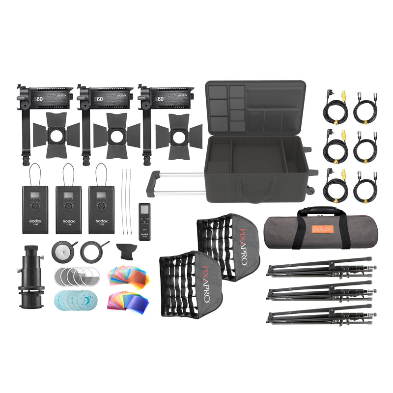 The Godox S60Bi Bi-Colour Adjustable LED Focus Spotlight Triple Kit offers a plethora of lighting options to choose from, due to the combination of 3x 60W Focusable LED Lights as well as a wide variety of modifiers and accessories. The lights in this kit, the Godox S60Bi units, are 60W 2800K ~6500K Bi-Colour light sources that gives you the ability to continuously vary the beam angle anywhere between 6° and 55° & an optical lens system that projects a silky-smooth graduated ball of light. To be used alongside these lights are several different modifiers such as a 30x30cm Softbox & Projection attachment with all the compatible accessories including Gobos and Gels. Each Lighting unit can be mounted onto a 190cm Foldable Light Stand and can be controlled using the RC-A6II Remote Control. All this equipment can then be stored in the 2x bags, the CB52 for the light stands and the CB51 for the remaining items. The Godox S60Bi Bi-Colour Adjustable LED Focus Spotlight Triple Kit is perfect for Cinematographers, as well as Photographers, who want to create a complete set-up focused on adding mood and drama to their shoots.