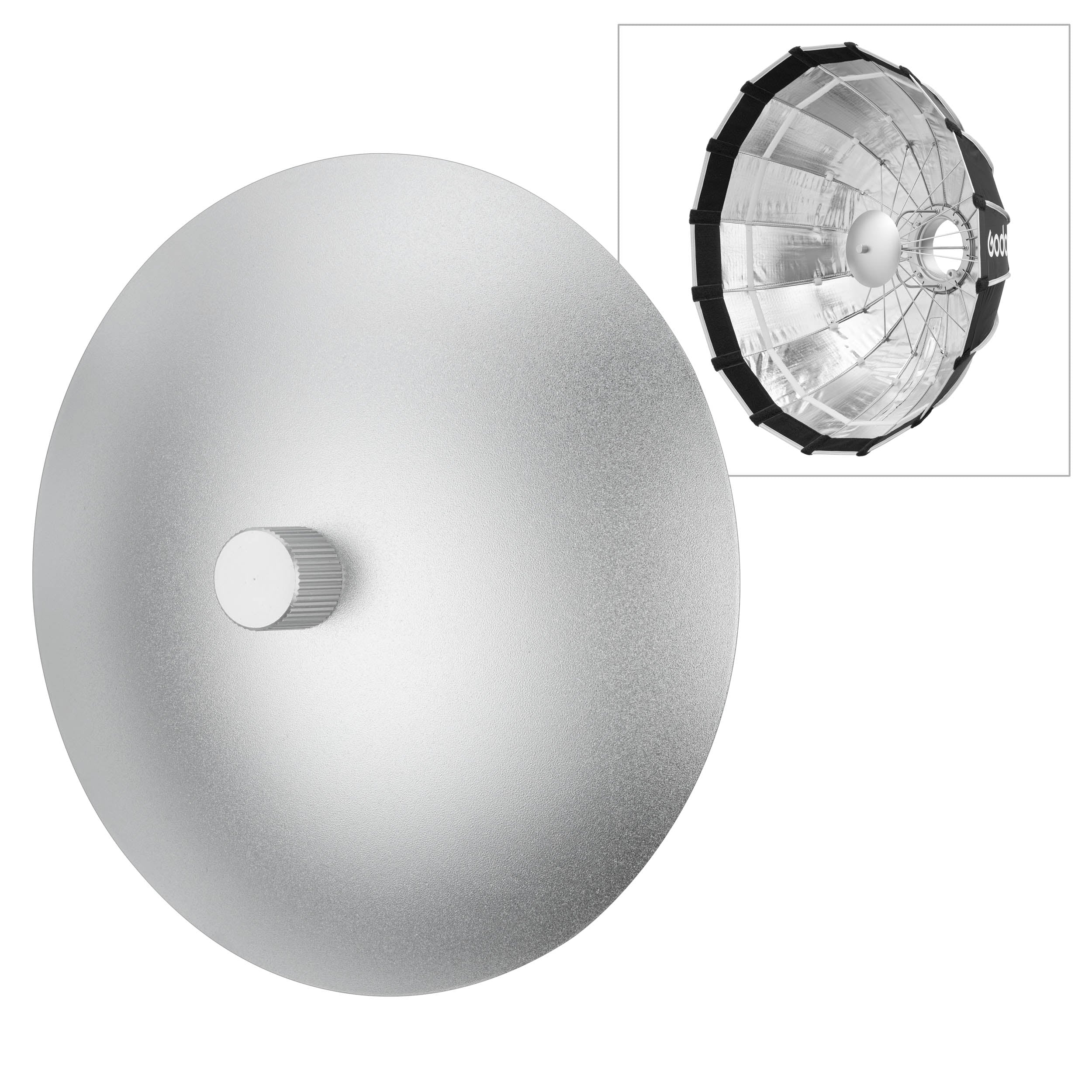 The Godox S65TDB Beauty Dish Deflector Plate mounts to the interior of your softbox, and is designed to prevent hotspots, if using the softbox without or with less diffusion. This enables you to achieve a more specular quality of light, without getting a bright spot in the centre.
