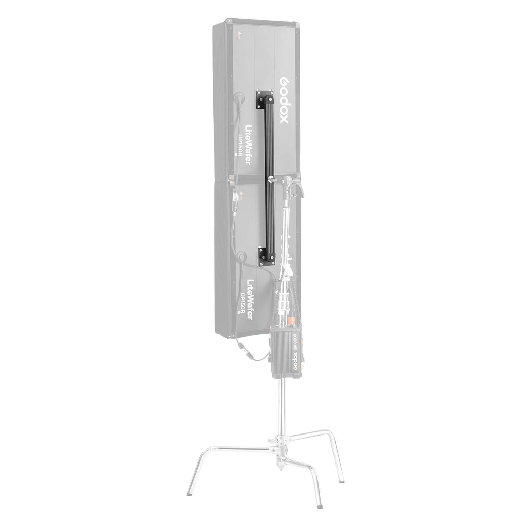 The Godox UP150RSC01 straight connector bracket has a robust metal construction with a built-in 5/8" Baby Pin, which enables it to be mounted to any light stand, C-Stand or Combo Stand.