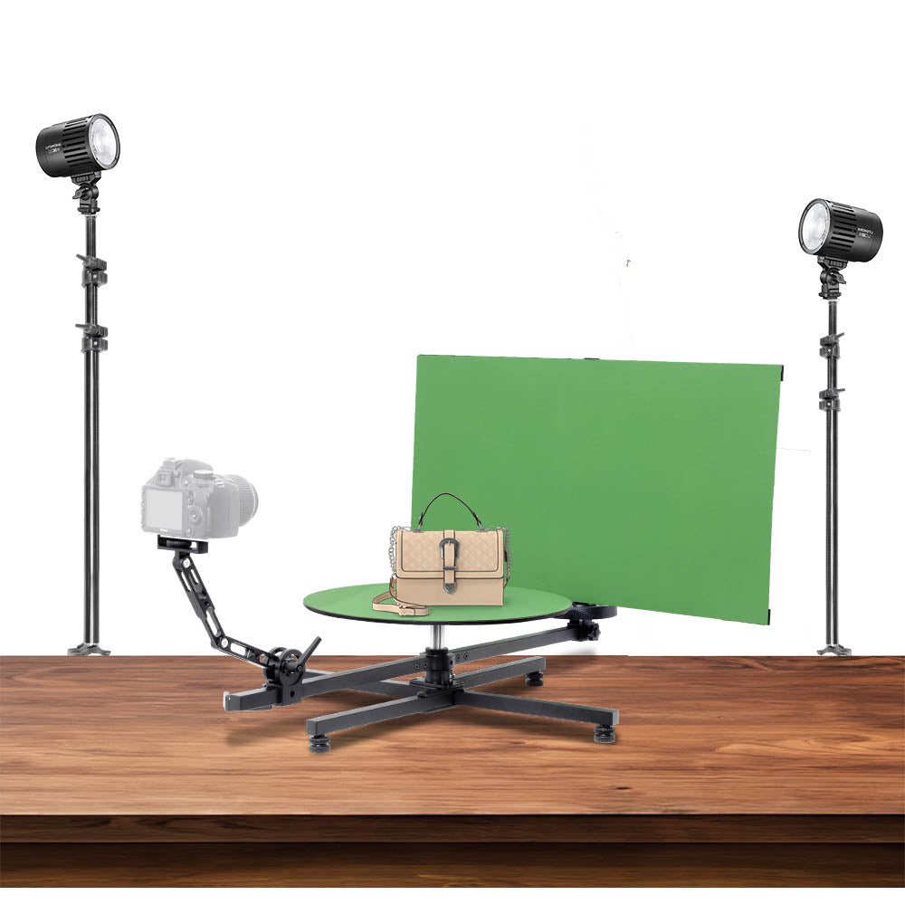 With two Litemons LC30D Tabletop LED Lights on table-mounted stands and a PIXAPRO® Rotable Platform – 360° Shooting Platform (White + Green Backdrop, Max Load 3 kg), you can: