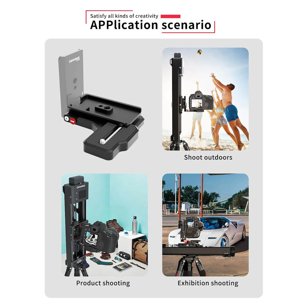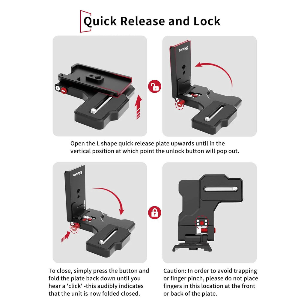 The iFootage LP-02 L-Shaped Quick Release Plate allows you to mount your camera vertically at 90°, enabling you to film in portrait orientation, ideal for platforms such as Instagram and TikTok with ease. Featuring a convenient folding mechanism and a secure safety-lock button, this Arca-style plate ensures stability. It comes equipped with a 1/4"-20 camera thread on one end and dual 1/4"-20 and 3/8"-16 mounting threads on the other, making it suitable for use with a wide range of cameras and accessories.
