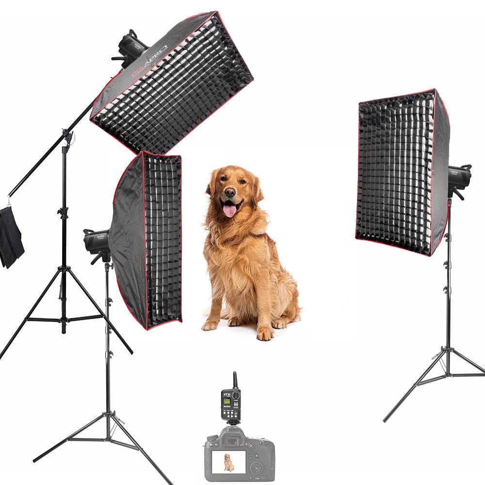 Built around three Godox MS300V studio flash heads, this kit allows you to create a complete lighting setup with a main light, fill light and hair or background light. The included softboxes with grids help shape the light while reducing spill, which is especially useful when working with reflective fur, darker coats or lively pets that move unpredictably.