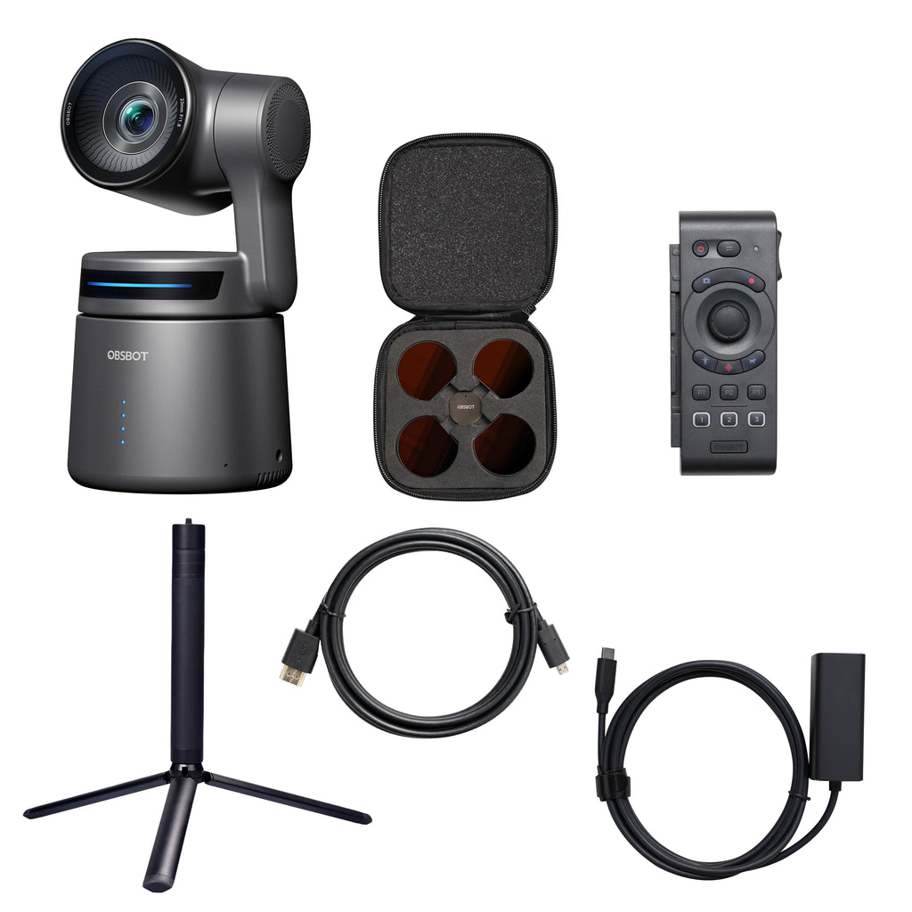 The OBSBOT Tail Air Power-Up Combo combines the amazing AI-Powered Webcam alongside an arrangement of accessories to offer the optimized results. The OBSBOT Tail Air AI-Powered PTZ 4K Streaming Camera uses the Power of AI for Unrivalled Tracking Capabilities, whilst also providing Ultra-Sharp 4K Footage, Voice and Gesture control & fast-accurate focusing. The ND Filters Set helps to control the level of light entering the camera lens with four different easy-to-attach lens filters. The additional of the Extendable Tripod allows the Webcam to be positioned in more locations, to helps capture the perfect video angle. The Tail Air Smart Remote offers remote control of various operations for up to three cameras at a time. There are two cables included in this Kit, the USB-C To Ethernet Adapter Cable & Micro HDMI To HDMI Video Cable, to provide additional connectivity options. This kit is a perfect complete set-up for Video Conferencing and Live-Streaming uses.