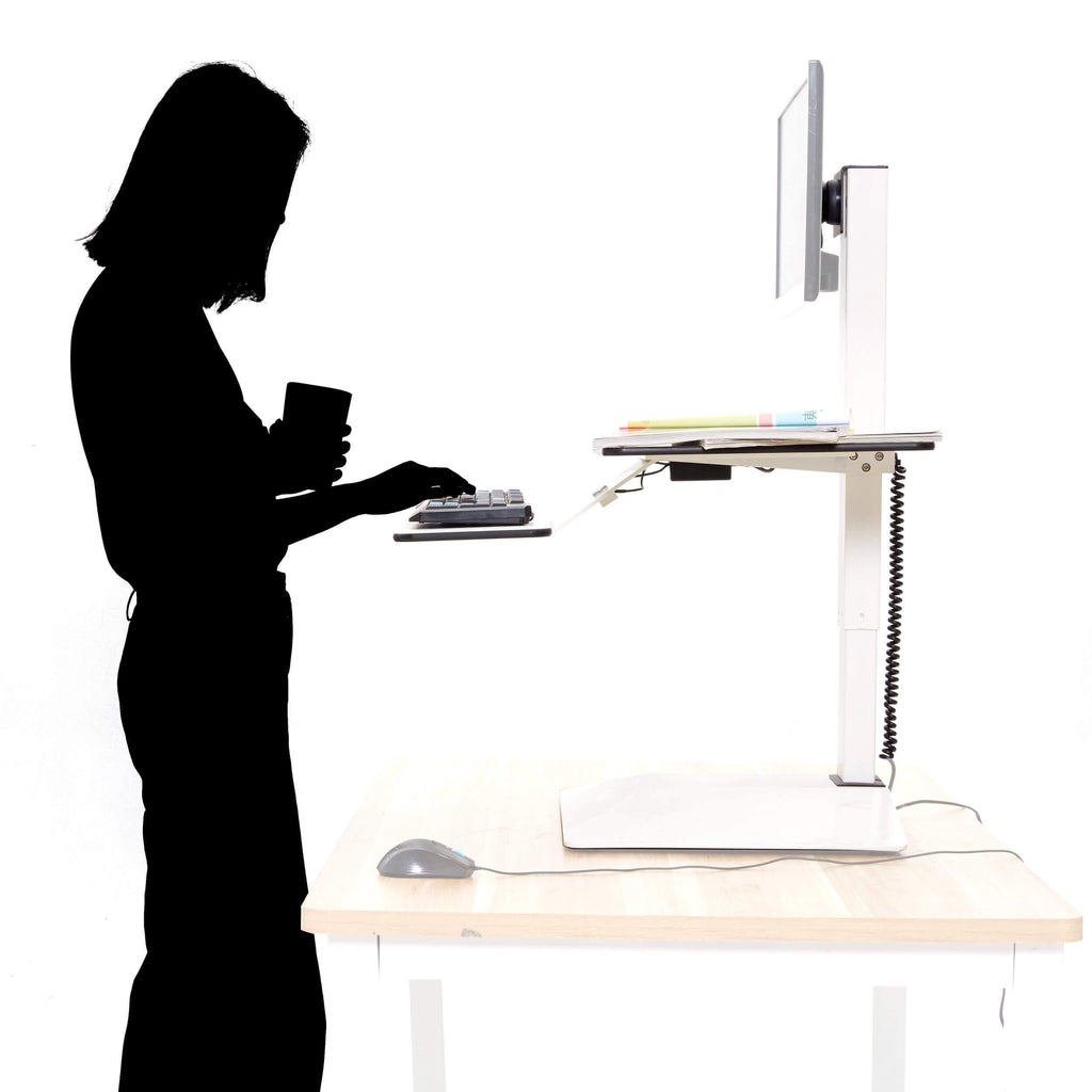 Its edgy and sleek design gives your office a modern touch. The TESSA-SMART workstation table top is using commercial-grade hard-wearing material for its work surface, which is suitable for heavy daily usage. It can hold a full-size keyboard and mouse, allows you to type comfortably whether you are in a standing position or sitting down, and remains sturdy and stationary while you work.