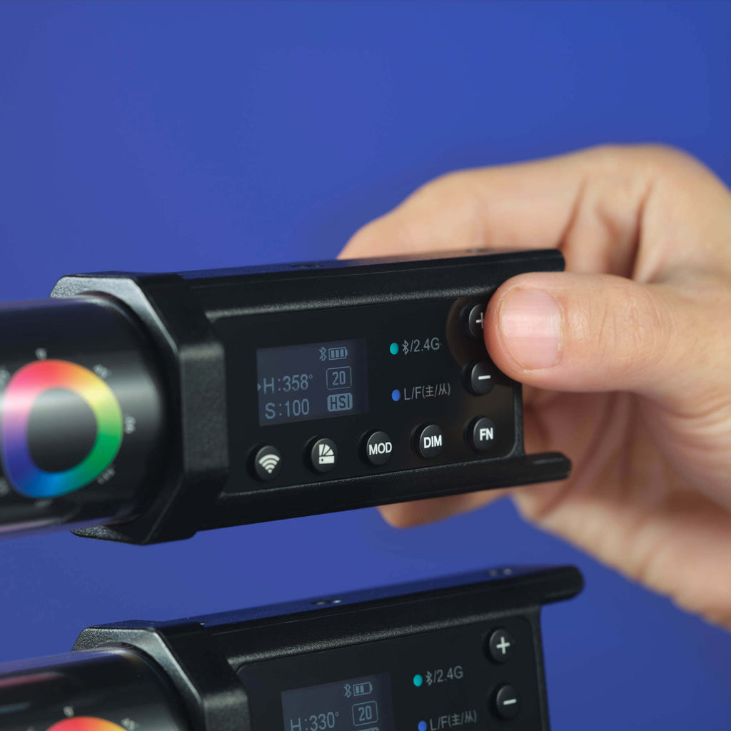 The TL120-K4 RGB LED light tube can be controlled in one of three different ways. You can control the TL120-K4 directly using the control panel on the light itself, you can use the RC-R9 2.4GHz Wireless Remote control (Available Separately), or via Bluetooth using a Godox Light smartphone app.